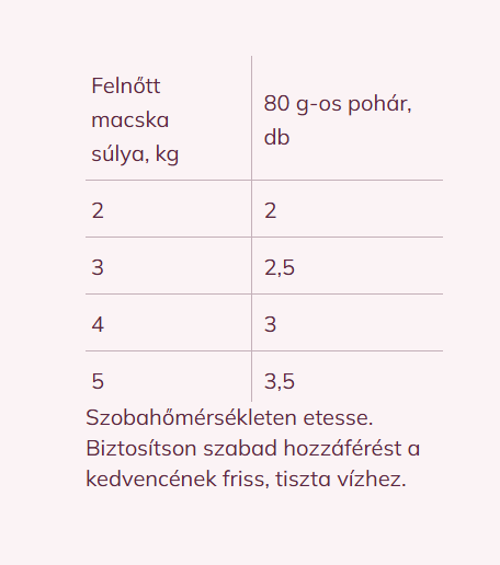 AJÁNLOTT NAPI ETETÉSI ÚTMUTATÓ: Felnőtt macska testsúlya (kg) – Tasak (db): 2kg – 2db, 3kg – 2,5db, 4kg – 3db, 5kg – 3,5db. Tálalás előtt szobahőmérsékletre felmelegítve kínáld. Mindig biztosíts friss, tiszta ivóvizet kedvenced számára.