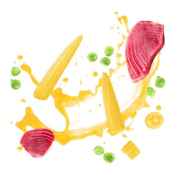 Összetétel: tonhal 37%, bébikukorica 2,5%, zöldborsó 2,5%, napraforgóolaj, tápióka keményítő, ásványi anyagok, xilóz.