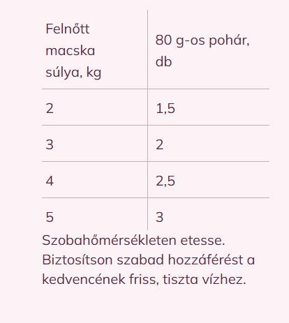 AJÁNLOTT NAPI ETETÉSI ÚTMUTATÓ: Felnőtt macska testsúlya (kg) – Tasak (db): 2kg – 2db, 3kg – 2,5db, 4kg – 3db, 5kg – 3,5db. Tálalás előtt szobahőmérsékletre felmelegítve kínáld. Mindig biztosíts friss, tiszta ivóvizet kedvenced számára.