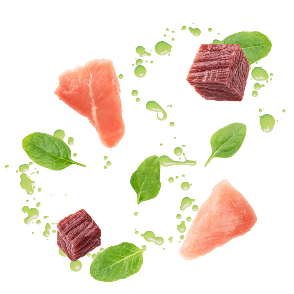 Összetétel: 87% hús és állati származékok szeletekben (csirkefilé 10%, kacsa 4%), gabonafélék, zöldségek (spenót 1%), ásványi anyagok, növényi eredetű származékok, olajok és zsírok (lazacolaj 0,25%).
