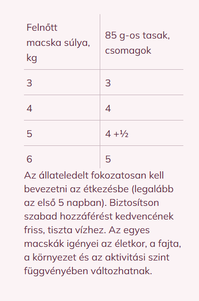 Adagolási javaslatok / nap: egy 3kg-os közepes testsúlyú macska adagja: naponta 3 tasak, 4kg-os – 4 tasak, 5kg-os – 4 +½ tasak, 6 kg-os - 5 tasak naponta. Az egyes macskák táplálékigénye eltérhet életkor, fajta, környezet és aktivitási szint függvényében.