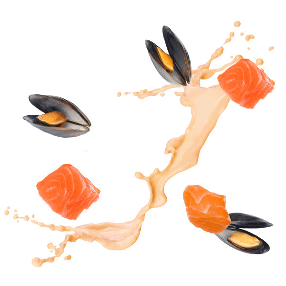 Összetétele: 68% hús és állati származékok szeletekben, puhatestűek és rákfélék (kagylók 10%), hal és halszármazékok (lazac 4%), gabonafélék, növényi fehérje kivonatok, ásványi anyagok. növényi eredetű származékok, olajok és zsírok (lazacolaj 0,22%).