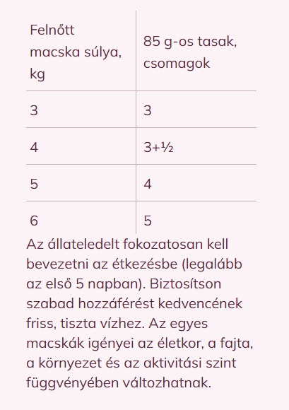 Adagolási javaslatok / nap: egy 3kg-os közepes testsúlyú macska adagja: naponta 3 tasak, 4kg-os – 4 tasak, 5kg-os – 4 +½ tasak, 6 kg-os - 5 tasak naponta. Az egyes macskák táplálékigénye eltérhet életkor, fajta, környezet és aktivitási szint függvényében.