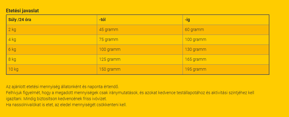 Összetevők : Teljes kiőrlésű kukorica; szárított baromfifehérje; rizs; cukorrépapép; baromfizsír; szárított kacsafehérje; hidrolizált baromfifehérje; ásványi anyagok; élesztő.