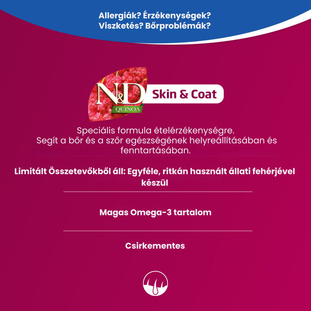 Fedezd fel az N&D Quinoa Skin & Coat erejét – a bőr és szőrzet egészségét támogató étrendet, allergiával vagy érzékenységgel küzdő kutyák számáras Magas omega-3 zsírsavtartalommal, L.I.D. – egyféle újszerű fehérjével, alacsony glikémiás indexszel.