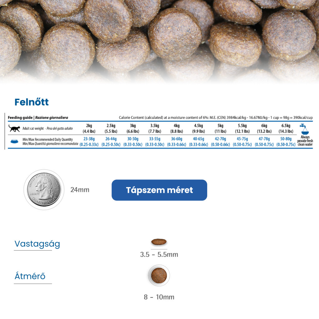 Adalékanyagok/kg - Tápértékkel rendelkező adalékanyagok: A-vitamin 18000NE; D3-vitamin 1200NE; E-vitamin 600mg; C-vitamin 300mg; Niacin 150mg; Kalcium-D-pantotenát 50mg; B2-vitamin 20mg; B6-vitamin 8.1mg; B1-vitamin 10mg; Biotin 1.50mg; Folsav 1.50mg; B12-vitamin 0.1mg; Kolin-klorid 2500mg; Béta-karotin 1.5mg; Cink (metionin-hidroxi-analóg cinkkelátja): 163.80mg; Mangán (metionin-hidroxi-analóg mangánkelátja): 64.60mg; Vas [glicin-hidrát vas(II)-kelátja]: 58.30mg; Réz (metionin-hidroxi-analóg rézkelátja): 15.80mg; DL-metionin, ipari tisztaságú 3500mg; Taurin 2000mg; L-lizin-monohidroklorid, ipari tisztaságú 1000mg, L-karnitin 250mg. Érzékszervi tulajdonságokat javító adalékanyagok: zöldtea kivonat 100mg; rozmaring kivonat. Antioxidánsok: növényi olajokból származó tokoferol kivonatok. Vizeletsavasító anyagok: ammónium-klorid 3500mg.