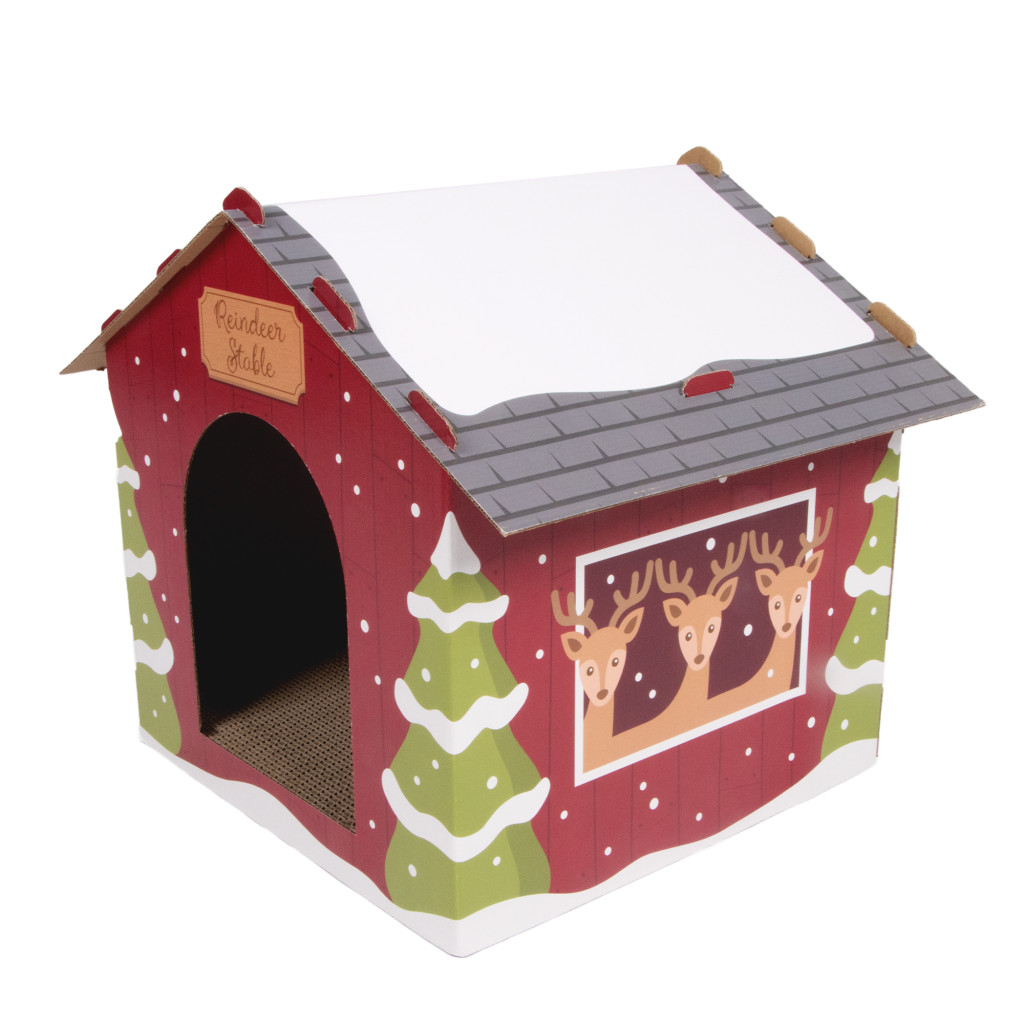 A zöld karácsonyfákkal, játékos rénszarvasokkal díszített, bájos piros pajtával ez a hangulatos téli menedékhely tökéletes macskája szórakoztatására és pihenésére.