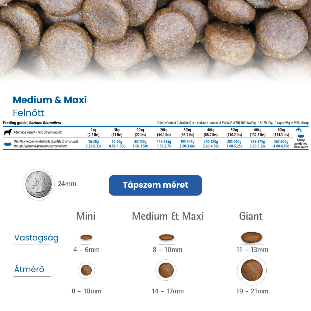 Analitikai összetevők: nyersfehérje 28.00%; nyerszsír 8.00%; nyersrost 8.20%; nedvesség 9.00%; nyershamu 7.90%; kalcium 0.90%; foszfor 0.80%; nátrium 0.30%, kálium 0.65%, magnézium 0.12%, Omega-6 zsírsavak 1.20%; Omega-3 zsírsavak 0.25%; DHA 0.12%; EPA 0.10%; glükozamin 1200mg/kg; kondroitin-szulfát 900mg/kg.