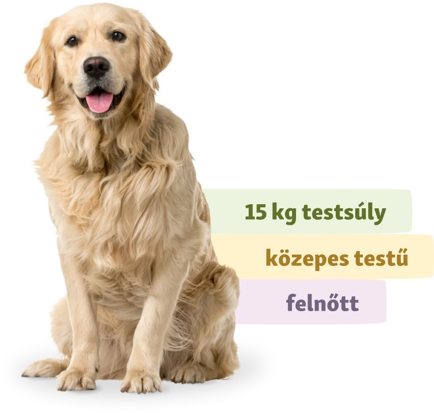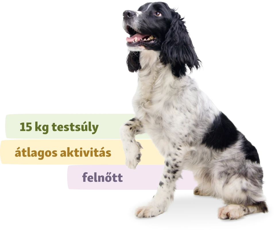 A napi etetési mennyiség a csomagolások hátoldalán található és a kutya súlyához van igazítva.