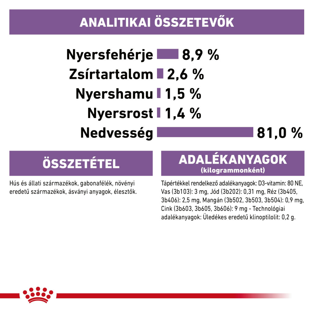 Analitikai összetevők: Nyersfehérje: 8,9 % - Nyersrost: 1,4 % - Zsírtartalom: 2,6 % - Nyershamu: 1,5 % - Nedvesség: 81,0 %.