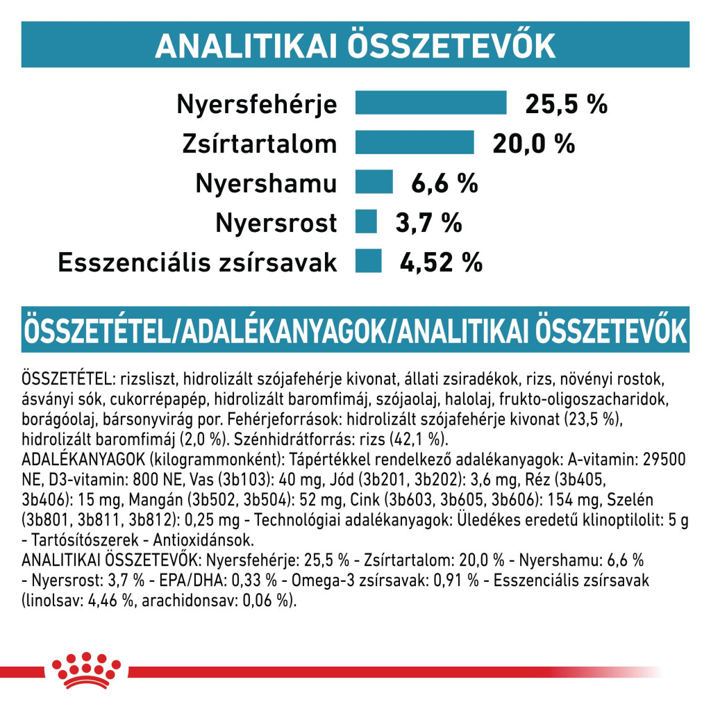 ÖSSZETÉTEL: rizsliszt, hidrolizált szójafehérje kivonat, állati zsiradékok, rizs, növényi rostok, ásványi anyagok, répapép, hidrolizált baromfimáj, szójaolaj, halolaj, frukto-oligoszacharidok, borágóolaj, bársonyvirág por. Fehérjeforrások: hidrolizált szójafehérje kivonat (23,5 %), hidrolizált baromfimáj (2,0 %). Szénhidrátforrás: rizs (42,1 %).